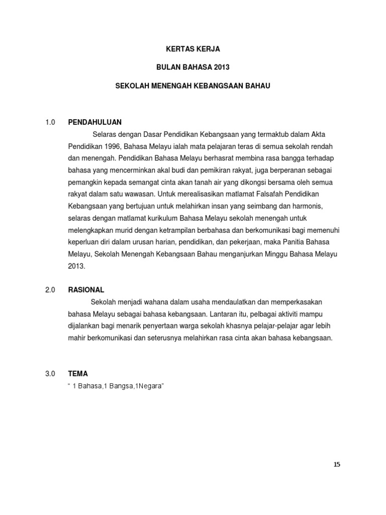 Bandar tun razak 1 kertas kerja minggu bahasa melayu. MINGGU PANITIA BAHASA MELAYU 2021 10. KERTAS KERJA UNTUK PROGRAM MINGGU BAHASA MELAYU 2019 SEKOLAH MENENGAH KEBANGSAAN DATO ALI AHMAD 10 PENDAHULUAN Dasar pendidikan kebangsaan telah dimuktamadkan dalam Akta Pendidikan 1996 sebagai mata pelajaran teras selaras dengan Akta 152 perlembagaan Malaysia iaitu Bahasa Melayu sebagai bahasa rasmi.