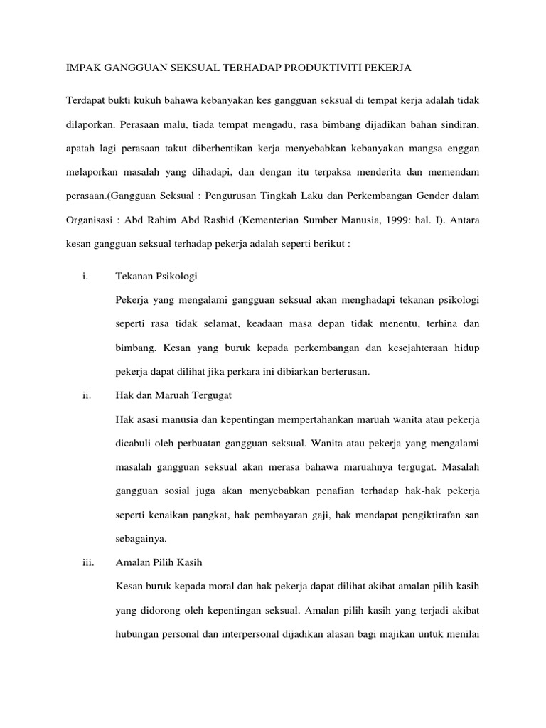 Jurnal jmm -volume-9-no1-june-2019 skhariv. Gangguan seksual bukannya perkara baru atau luarbiasa. Disebabkan kuasa dan pengaruh golongan ini dalam organisasi mereka yang menjadi mangsa gangguan seksual terpaksa tunduk kepada kehendak pegawai atasan.
